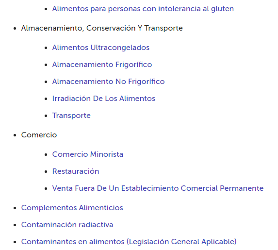 En este último apartado, subdivide por temáticas de los diferentes asuntos que competen a la seguridad alimentaria. Dentro de cada tema, además de otra información, incluye información relativa a la legislación del mismo.