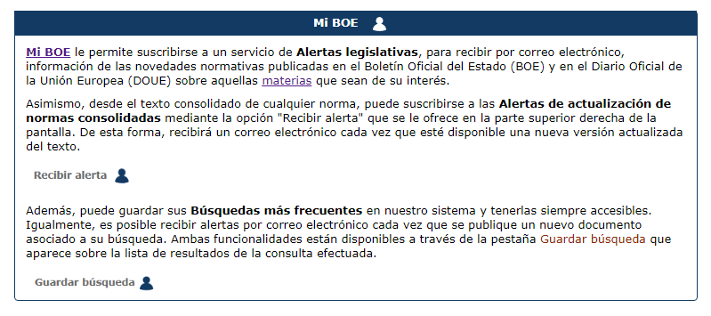 Esta herramienta funciona dándose de alta en “MI BOE”, yendo a la pantalla de búsqueda y a continuación bajar hasta alertas legislativas. Una vez ahí, pinchar en materias y seleccionando aquellas de interés o activar las aletas de actualización de normas consolidadas clicando en “recibir alerta” en la pantalla de la legislación de interés.